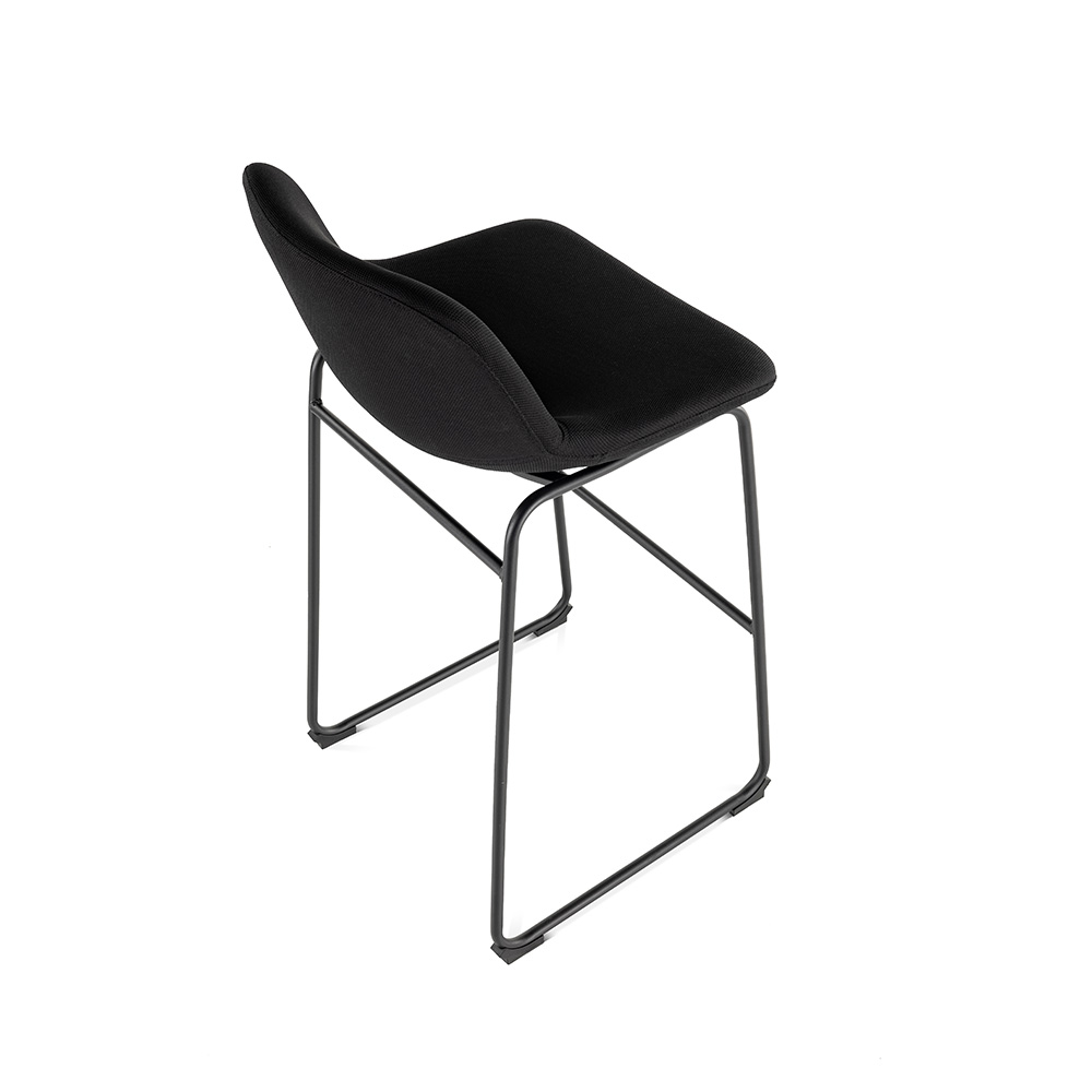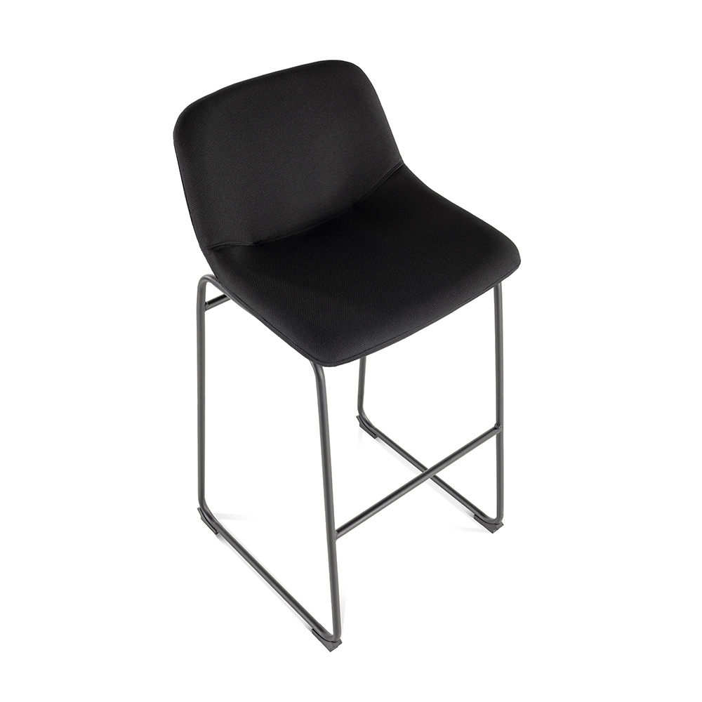 Asiento y respaldo: Monobloque tapizado en tela ignífuga con acolchado. Respaldo bajo para apoyo cómodo sin recargar visualmente el espacio.